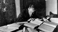 Eliezer Ben-Yehuda di mejanya di Yerusalem, sekitar tahun 1912 (Universitas Harvard)