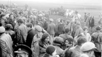 Anggota Kibbutz Ein Harod menerima anak-anak dari Jerman di stasiun kereta api di Afula, Februari 1934 (Koleksi Foto Nasional Israel)